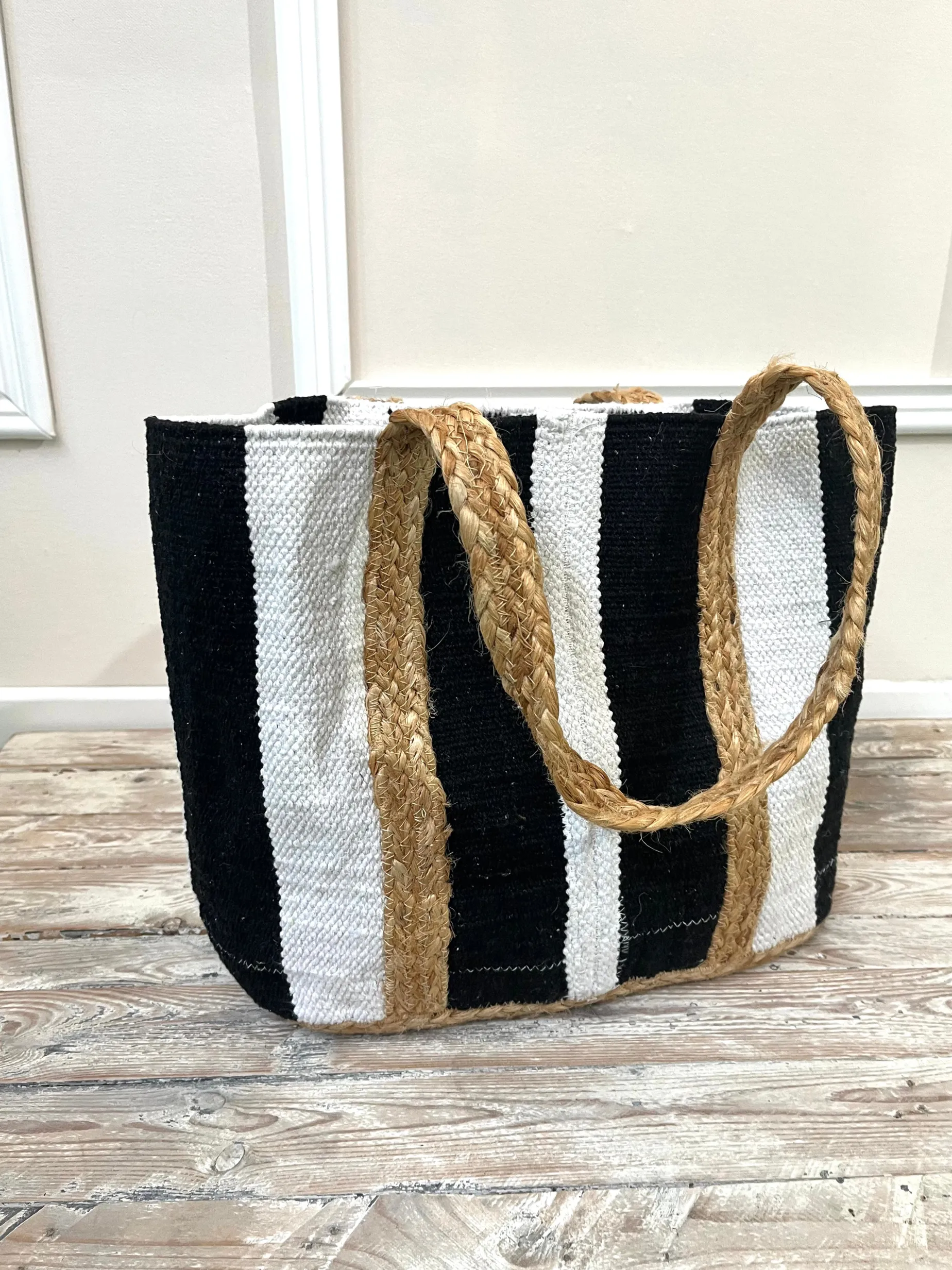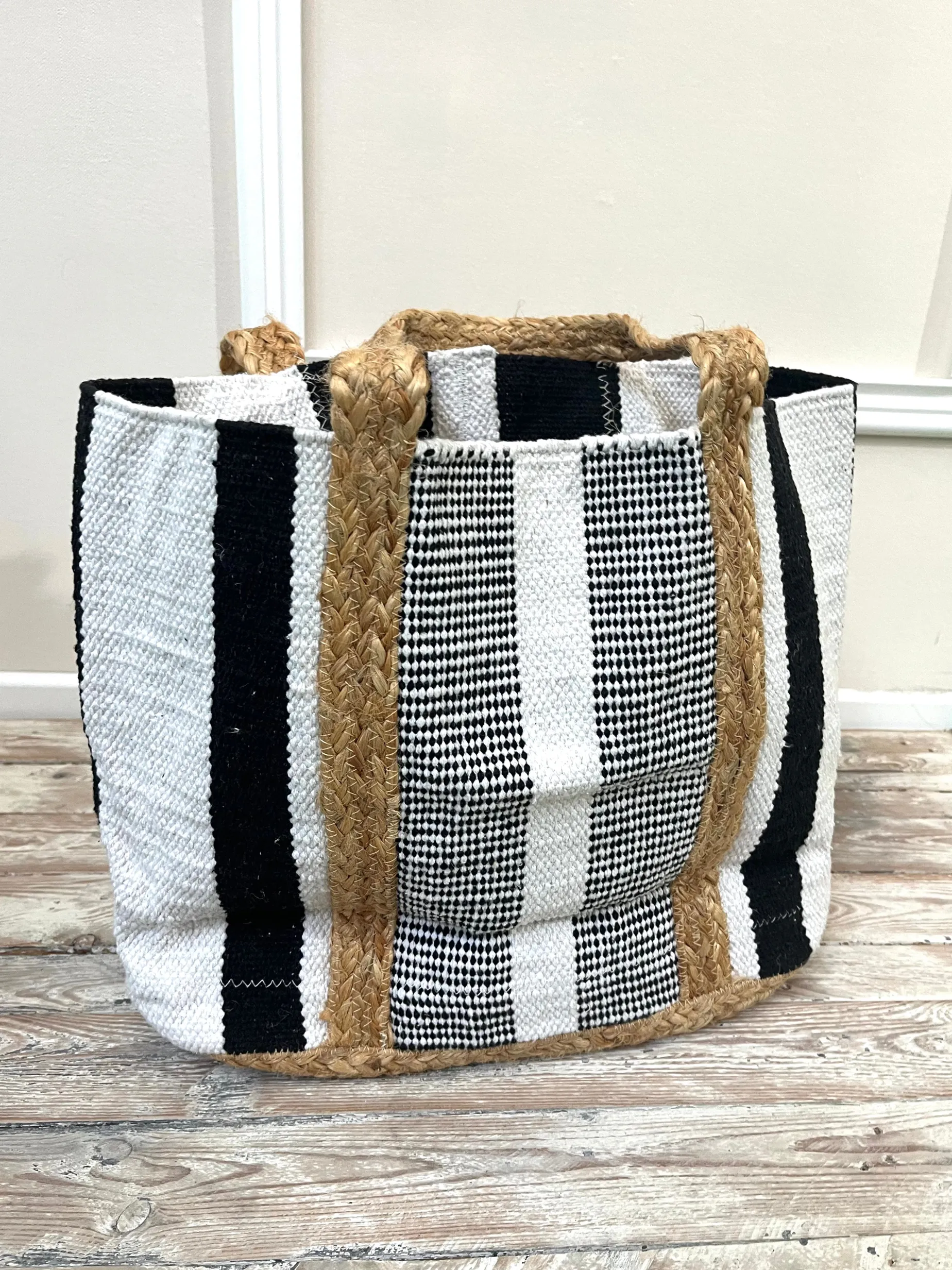 Bolso de esparto con rayas blancas y negras: