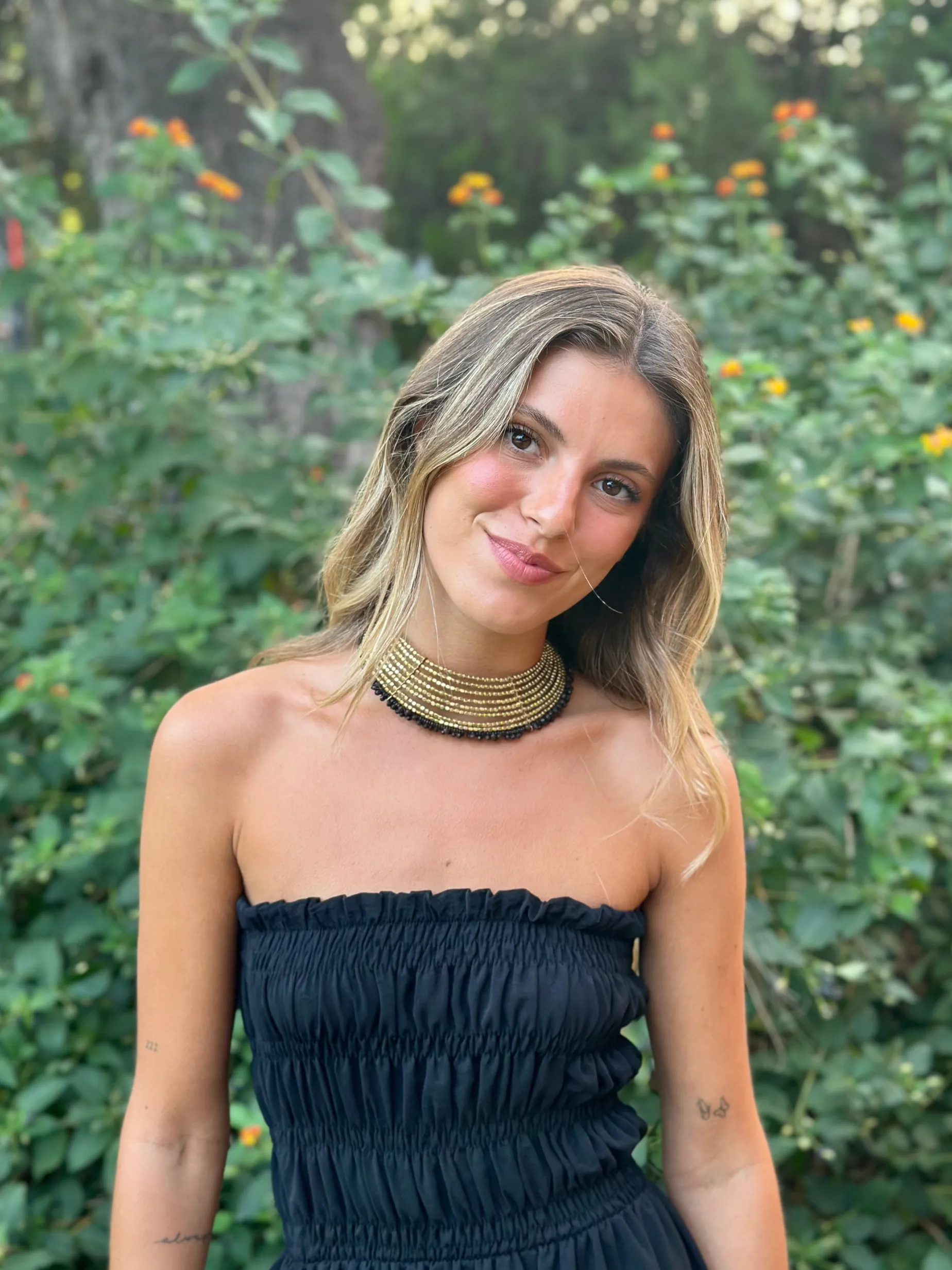 chocker adaptado al cuello en dorado con bolas en negro abajo.