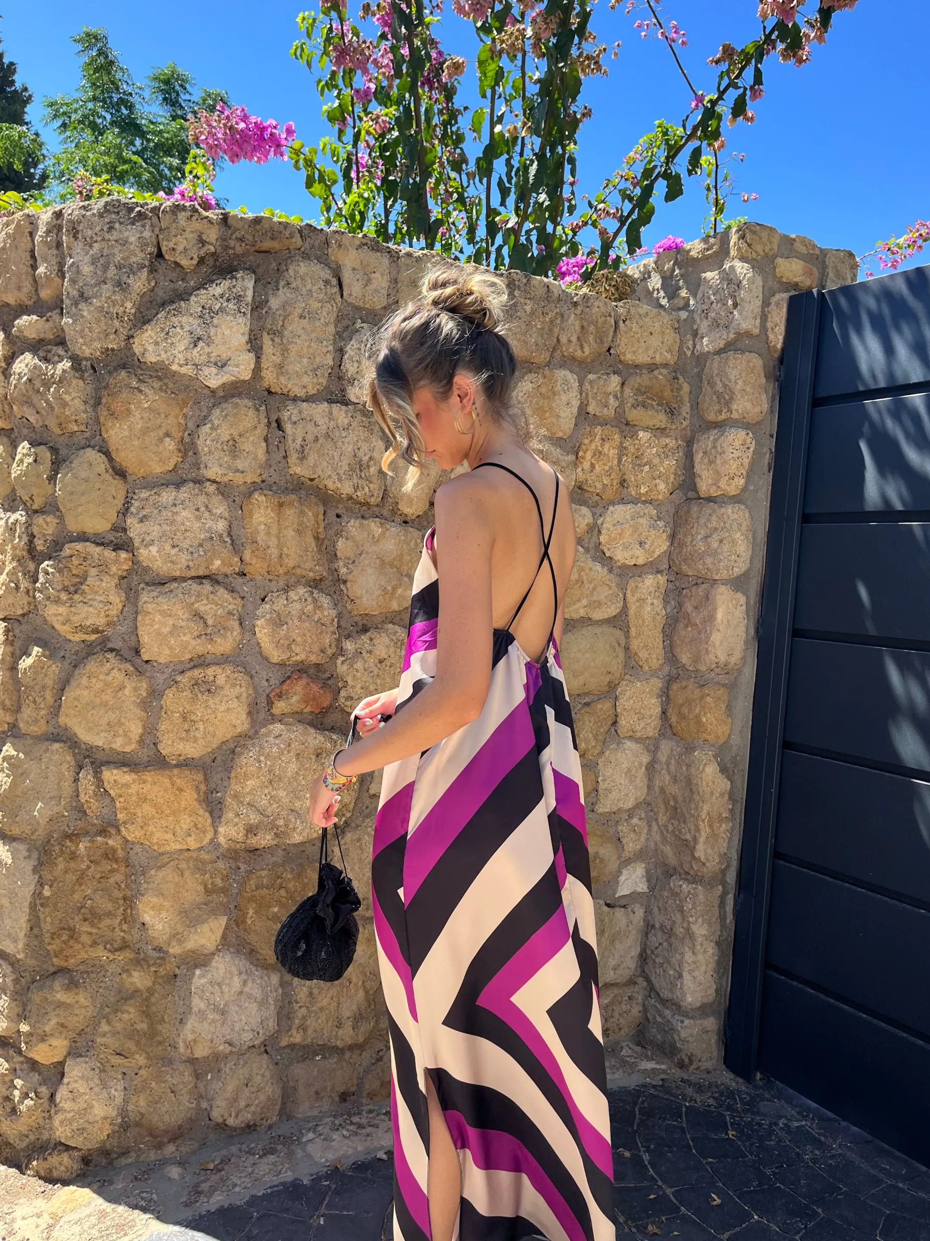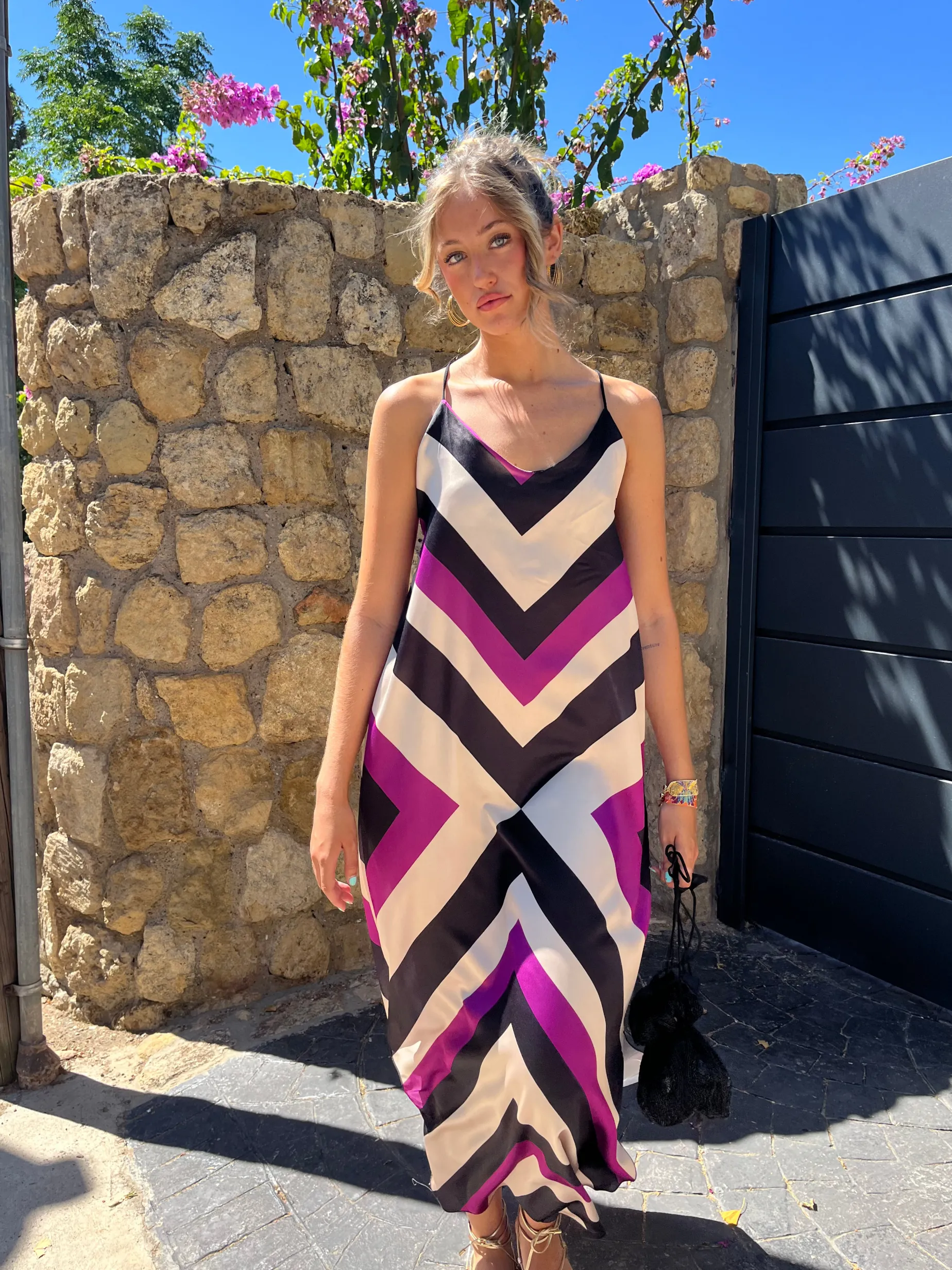 Vestido largo cruzado en espalda. Estampado a rayas en zigzag.